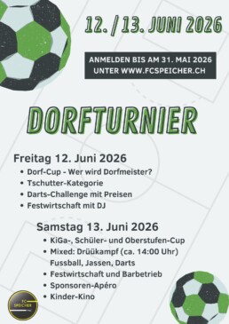 Am 12. & 13. Juni 2026 findet erneut das Dorfturnier des FC Speichers statt. Nach drei erfolgreichen Dorfturnieren mit jeweils rund 60 Mannschaften freuen wir uns über die nächste Ausgabe des Dorfturniers. Ziel bleibt es, möglichst viele sportbegeisterte Einwohnerinnen und Einwohner aus Speicher und der Region zusammenzubringen und gemeinsam ein Wochenende voller Sport, Spiel und Gemeinschaft zu erleben.